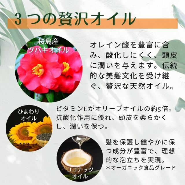 | ご使用方法 | 1. ブラッシングにより汚れや髪のホツレが取り除かれ、シャンプー効果が高まりますのでシャンプー前にブラッシングされることをおすすめします。 2. 泡をたっぷり取り、髪にのせてパックするようにやさしく洗います。頭皮は指先で軽くマッサージします。 3. しっかりと洗い流してください。洗い流し始めるとキュッとした感覚がでてきます。その後も少し頭皮をマッサージしながら、お湯で洗い流し続けることがポイントです。(すぐに洗い流しをやめてしまうと石けんカスが残ってしまいべたつき、ごわつきの原因となります。) 4. 使用後は専用リンス(オリエンタルアロマリンス)を使用してください。 |