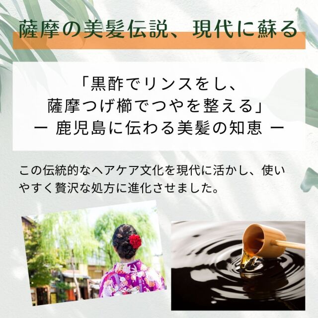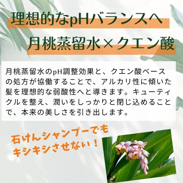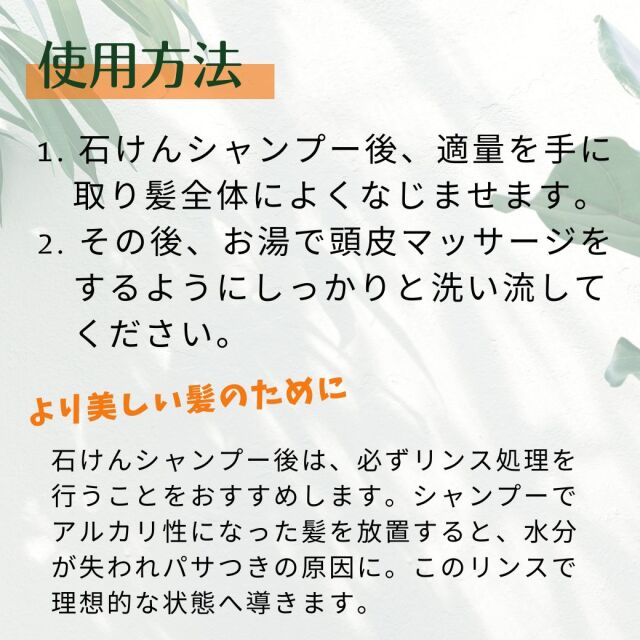 | ご使用方法 | 1. 石けんシャンプー後、適量を手に取り髪全体によくなじませます。 2. その後、お湯で頭皮マッサージをするようにしっかりと洗い流してください。 |