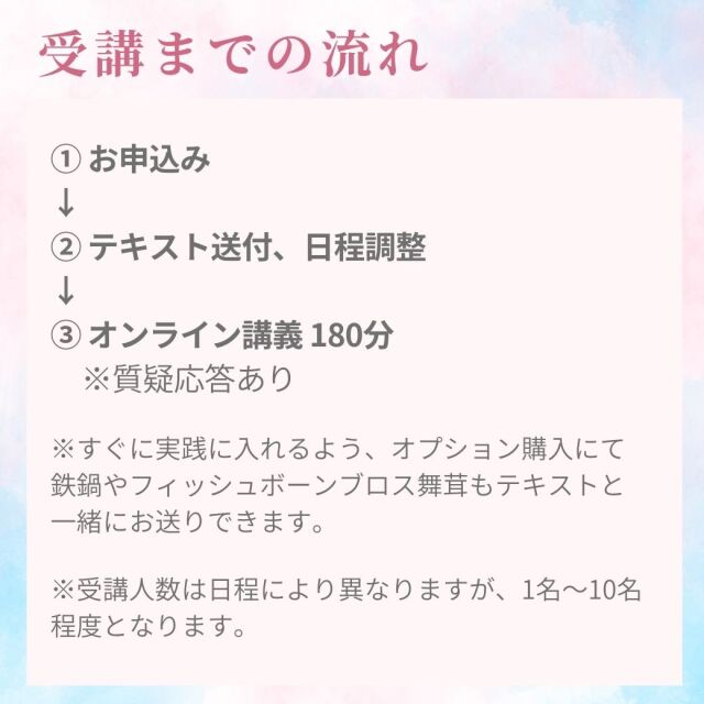 *講師との日程調整などがありますので、実際にご受講いただくまでに2週間以上かかることもございます。予めご了承ください。