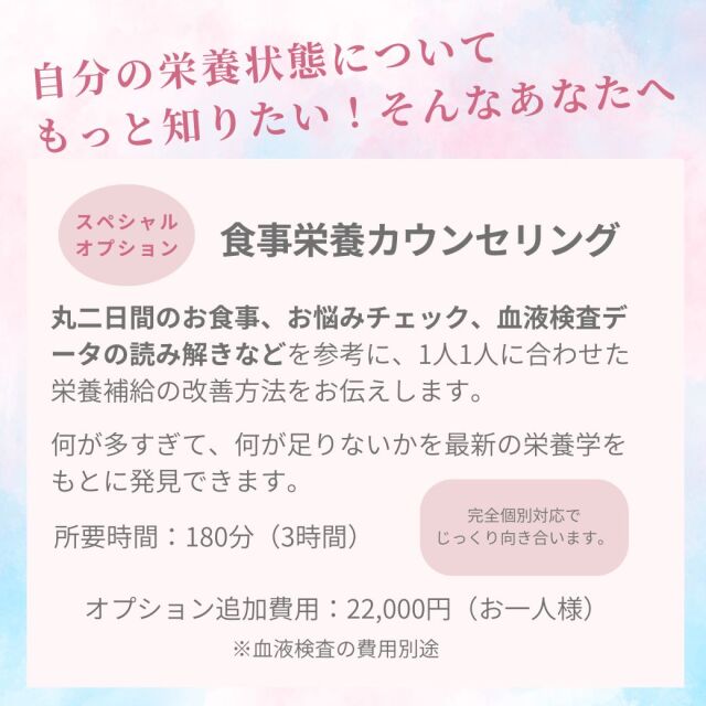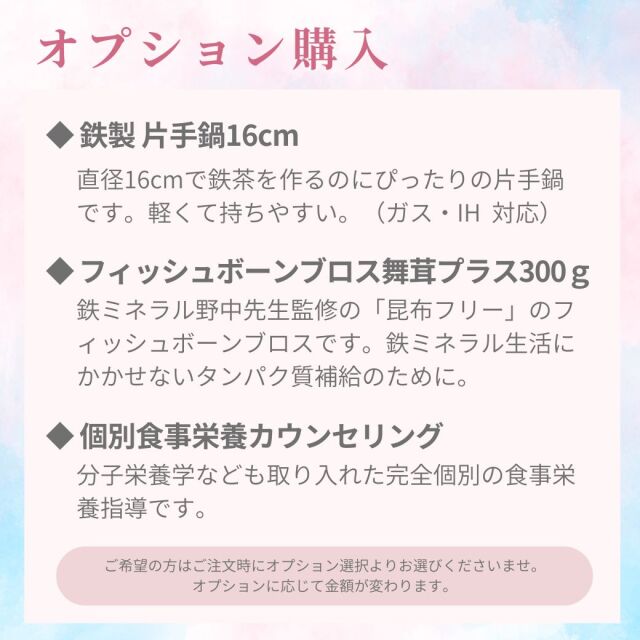 鉄鍋(片手お味噌汁パン)、フィッシュボーンブロス舞茸プラス300g、個別食事栄養カウンセリング(180分)は有料オプションとなります。必要に応じてオプションを追加してご購入くださいませ。